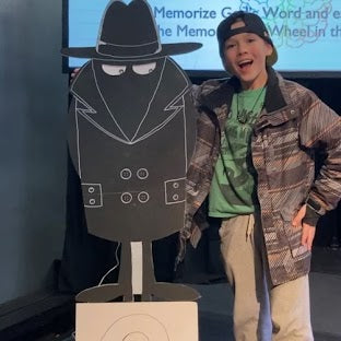 Cooper brought creativity to life by designing and building room and stage décor that matched monthly lesson themes. In the picture, you can see a motorized prop Cooper built for the "Secret Identity" series—a figure whose eyes glance back and forth every few seconds, showcasing Cooper’s innovative design skills.